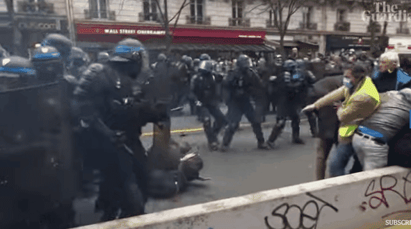 《衞報》分享的一則視頻顯示,警方與“黃背心”成員爆發衝突,推倒了幾名示威者。而抗議者站的十分密集,部分人員未戴口罩。