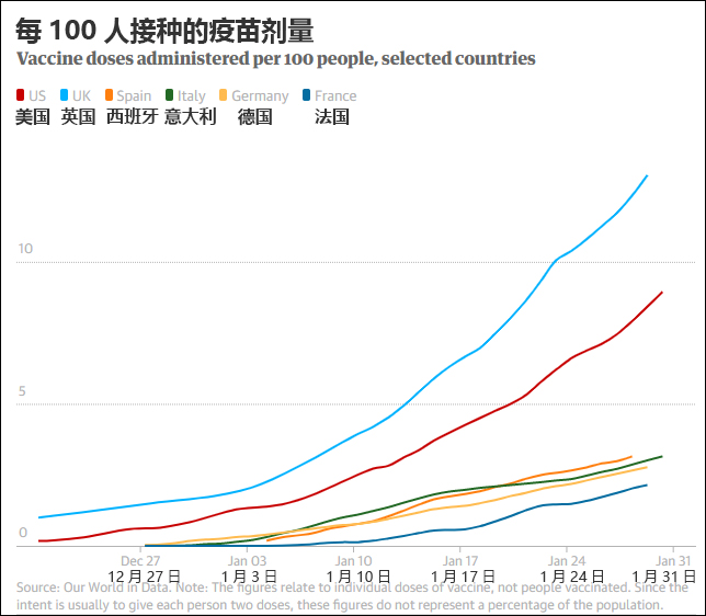 圖自《衞報》 注:數據與疫苗劑量有關,而非接種人數。由於通常每人要接種兩劑,上述數字不代表人口接種率。