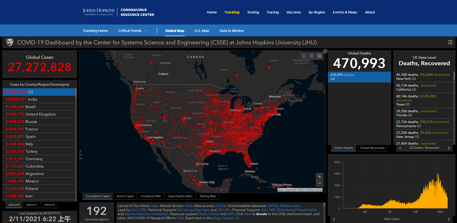 (觀察者網訊)根據美國約翰斯·霍普金斯大學統計的數據,截至北京時間2021年2月11日6時22分,美國新冠肺炎確診病例總數27272828例,死亡病例總數達到470993例。在過去約25小時裏,美國新增確診病例112520例,新增死亡病例4002例。