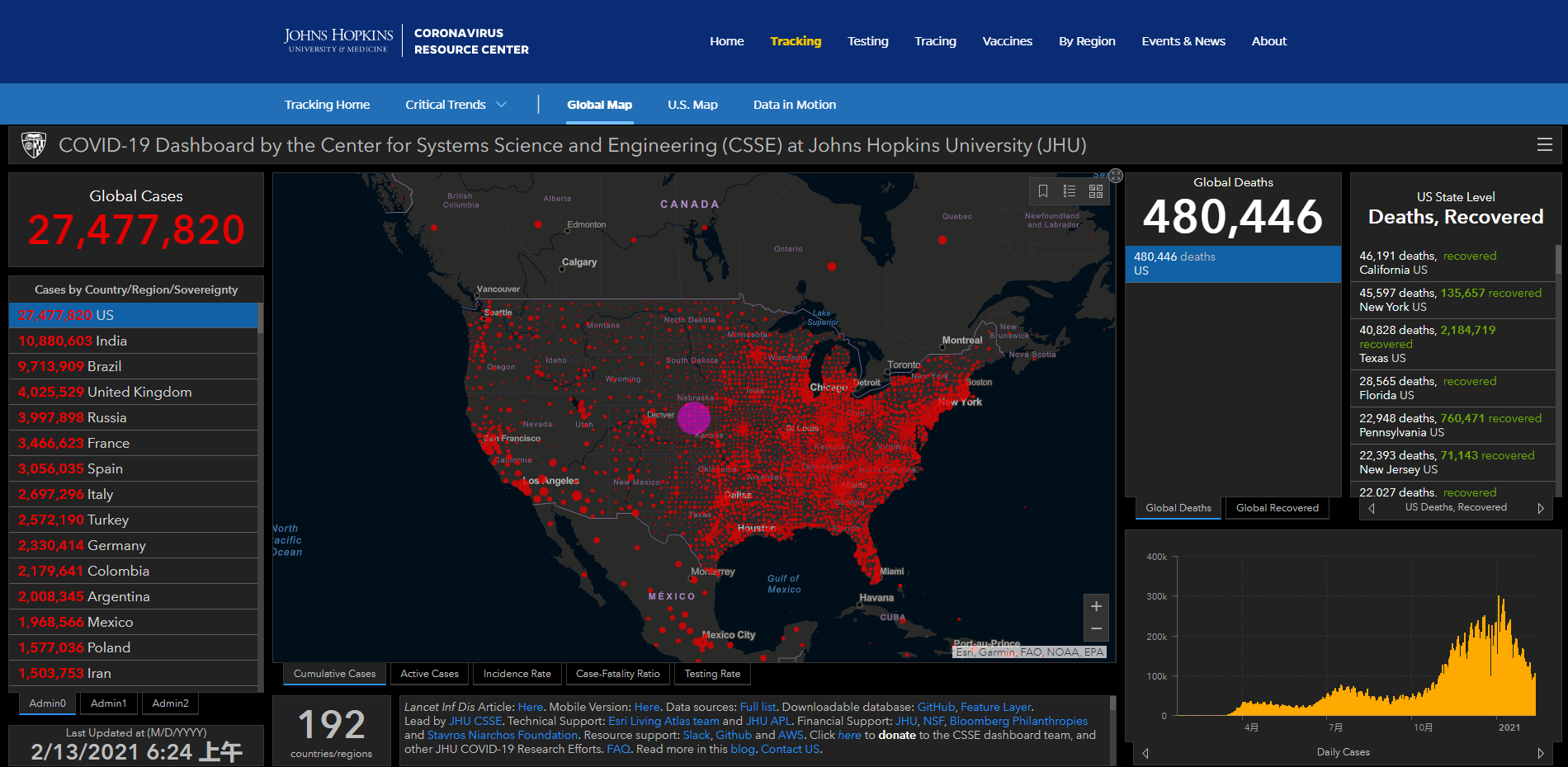 (觀察者網訊)根據美國約翰斯·霍普金斯大學統計的數據,截至北京時間2021年2月13日6時24分,美國新冠肺炎確診病例總數27477820例,死亡病例總數達到480446例。在過去約24小時裏,美國新增確診病例98939例,新增死亡病例5458例。