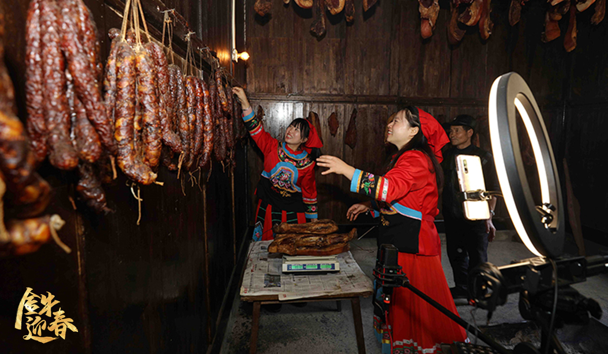 2021年1月15日,電商服務志願者通過直播的方式幫助偏遠山村羣眾推介銷售臘肉、香腸等特色“年味”農產品。