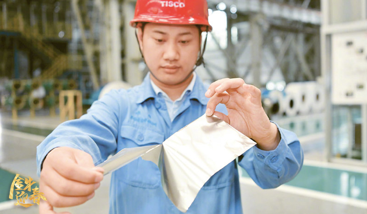 太鋼不鏽鋼精密帶鋼有限公司員工在展示用手撕開0.02毫米厚的寬幅軟態不鏽鋼精密箔材。
