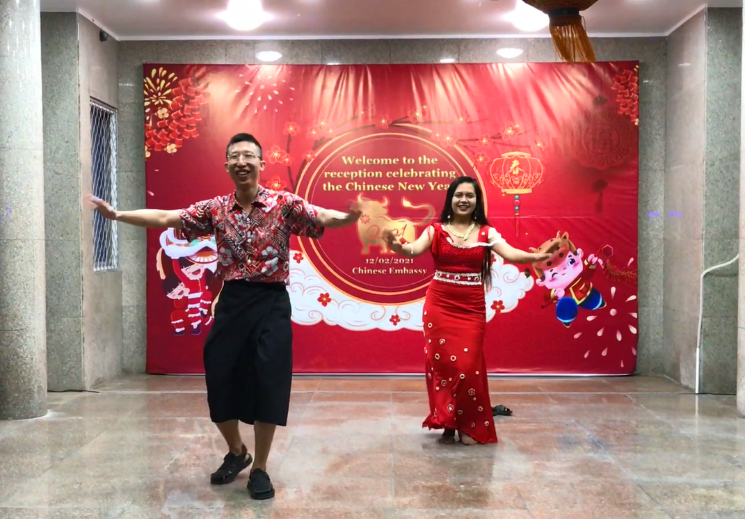 招待會上,馬茂總統和唐大使共同為舞獅點睛,將現場氣氛推向高潮。同胞們獻上舞龍表演,華人兒童向賓客展示拜年、放鞭炮、貼福字等春節習俗,增添了節日色彩。當地女歌手用中文演唱一曲《好日子》,使館外交官和專家組成員表演基里巴斯特色歌舞,展現了兩國文化的交流融合,引來觀眾陣陣喝彩。來賓們饒有興致地學習“新年快樂”和抱拳禮,作為當晚特殊的中式開餐儀式(當地傳統開餐儀式為當地語“歡慶”,同時舉手並握拳)。