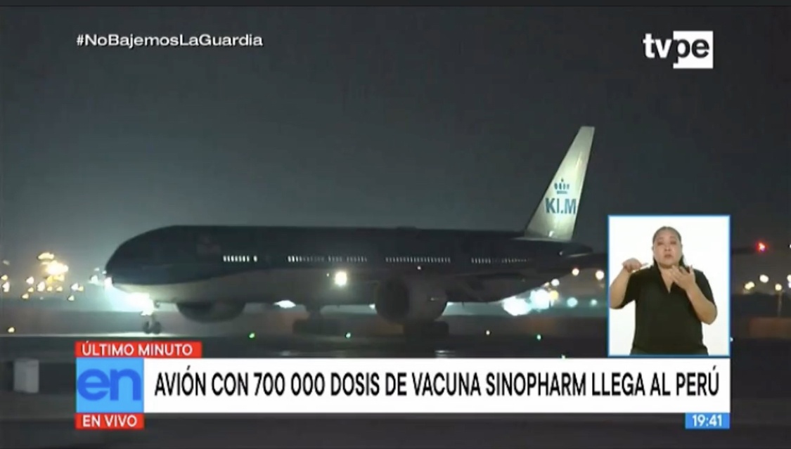 秘魯部長會議主席貝穆德斯,以及當天上午剛剛宣誓就職的秘魯新任衞生部長奧斯卡·烏加特和中國駐秘魯臨時代辦李昀到機場迎接。秘魯國家電視台等多家主流媒體現場直播了疫苗抵達和卸載的全過程,秘魯當天出動1100多名軍警負責當天新冠疫苗在利馬的運輸安保工作。