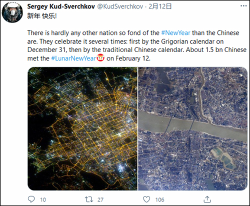 (觀察者網訊)中國農曆大年初一(2月12日)這天,俄羅斯航天員謝爾蓋·庫德·斯維奇科夫(Sergey Kud-Sverchkov)用相當與眾不同的方式給中國人拜年了:他從國際空間站送上來自太空的新春祝福,還附上了從太空拍攝的北京市與武漢市的照片。