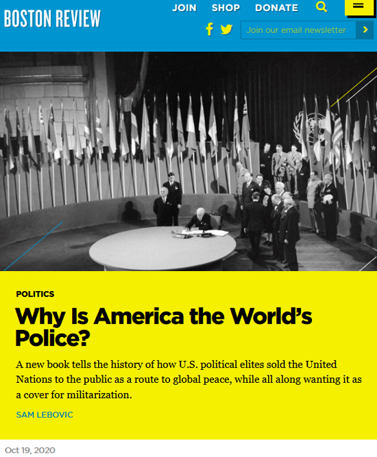 歷史學者史蒂芬·沃特海姆(Stephen Wertheim)在其2020年10月出版的《明日世界:美國全球霸權的誕生》(Tomorrow, the World: The Birth of U.S. Global Supremacy)一書中。對美國社會的上述心態給出了自己的解釋。