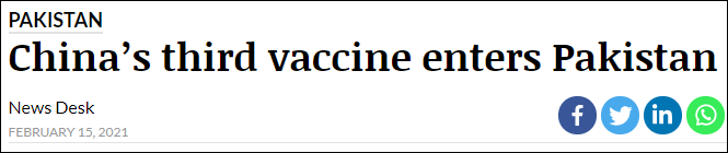 當地時間2月15日,巴基斯坦《每日時報》(Daily Times)以“中國第三款疫苗進入巴基斯坦”為標題,對此事進行了報道。