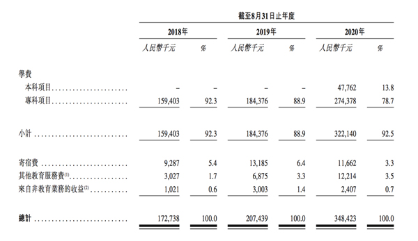 招股書還顯示,2018至2020財年,“中國科大教育集團有限公司”營收快速增長,分別為1.73億元、2.07億元和3.48億元,複合年增長率約為42%,主要來自廣科大學生所繳學費,佔比分別達92.3%、88.9%和92.5%。在校生人數增加和學費標準提高,是“中國科大教育集團有限公司”收入增長的兩大因素。