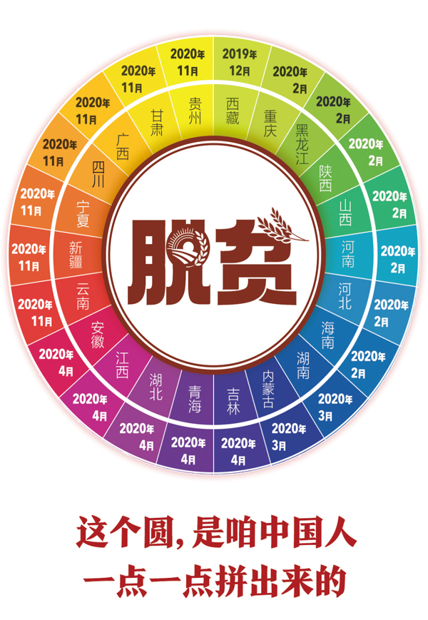 2020年11月23日,貴州省宣佈最後9個貧困縣退出貧困縣序列。至此,國務院扶貧辦確定的全國832個貧困縣全部脱貧摘帽。這是22個省份宣佈貧困縣“清零”的時間示意圖。 央視新聞供圖
