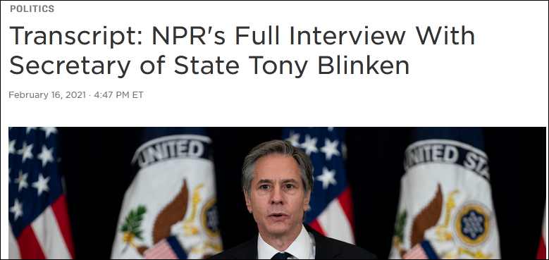 美國國家公共電台(NPR)2月16日刊載的一份專訪顯示,布林肯聲稱特朗普政府對華的強硬態度是正確的,但是在策略上出現了問題,以至於沒取得什麼成效。