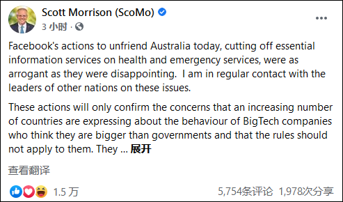 對於臉書向澳大利亞採取限制措施,澳總理莫里森在其個人臉書上發文寫道:“臉書今天做出了和澳大利亞解除友好關係的行為,切斷了健康和急救服務這些基本信息內容,既傲慢又令人失望。”