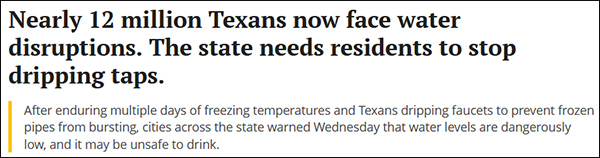 環境質量委員會執行主管託比·貝克(Toby Baker)稱,有大約26.4萬人得州民眾的供水完全中斷。供水系統癱瘓主要是由水管爆裂、供水設施斷電、水壓過低等問題引起的。