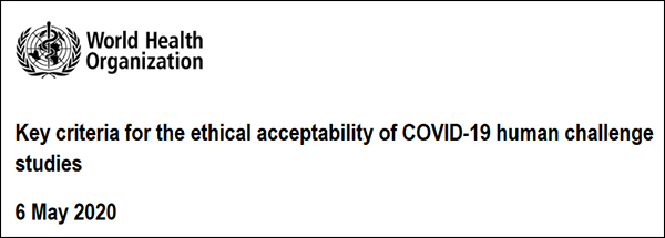 2020年5月,世界衞生組織已就此類試驗發佈過指導意見。世衞組織指出,故意感染試驗在特定條件下在倫理上可被接受,但必須仔細設計和進行試驗,儘可能減少對志願者的傷害;在涉及較高風險、較高不確定性、公眾對研究的信任極具重要性等情況時,試驗應以更高標準進行。