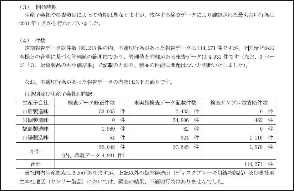 曙光制動在公告中稱,2019年11月,公司質量保障部門向董事長彙報時指出,公司下屬的山形工廠在向客户提交的零件定期檢查報告中,質檢數值記載中存在不當行為。同年12月,曙光制動開啓內部自查。2020年2月起,曙光制動將調查對象擴大至日本國內所有工廠。