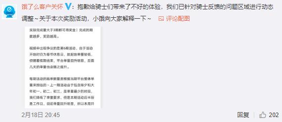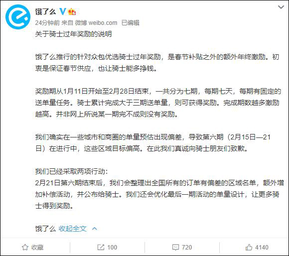 當晚(18日),餓了麼旗下微博賬號@餓了麼客户關懷 在爭議微博下回應稱:本次活動是在每單春節補貼之外的額外年終激勵,一共分為7期,每期持續7天。騎士累計完成大於3期,則可獲得獎勵。若只有一期沒有完成,也是可以拿到獎勵的(只要實際完成量大於3期都可得獎金),完成的期數越多,獎勵越高。