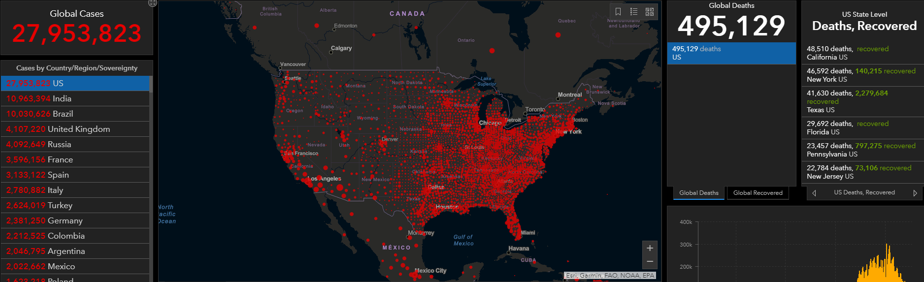 (觀察者網訊)根據美國約翰斯·霍普金斯大學統計數據,截至北京時間2021年2月20日5時24分,美國新冠肺炎確診病例總數27953823例,死亡病例總數達495129例。在過去約24小時裏,美國新增確診病例72095例,新增死亡病例2483例。