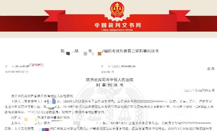 2月1日,咸陽市中級人民法院對這起跨省組織作弊案作出終審判決。圖片來源/中國裁判文書網