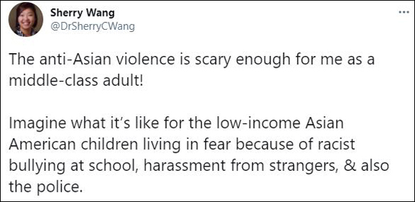 王雪莉在推特上呼籲:“作為一箇中產階級成年人,反亞暴力對我來説就已經夠可怕的了,想象一下,那些因校園霸凌,受陌生人甚至是警察騷擾的低收入亞裔美國孩子,生活在怎樣的恐懼之中”。