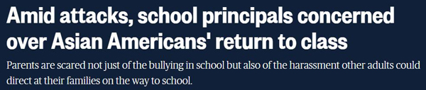 報道指出,隨着學校繼續開放,與病毒有關的種族主義可能會加劇已有的問題。聖克拉拉大學(Santa Clara University)教育與心理諮詢學院亞裔副教授王雪莉(Sherry C. Wang,音譯)在接受NBC採訪時表示,由於美國教育體系在很大程度上抹去了亞裔人的奮鬥歷程,成人和兒童往往對於這個羣體有很大的誤解。因此,教育工作者和家長應在家中教育子女、消除誤解,確保他們就種族問題進行真正的對話。
