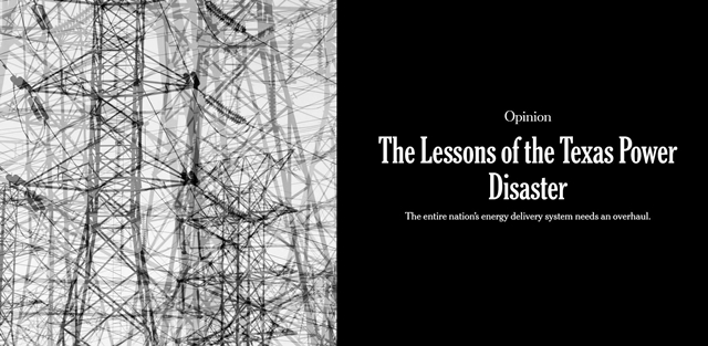 《紐約時報》19日編輯部專欄刊文“得州電力災難的教訓-全國能源輸送系統需要全面改革” 報道截圖