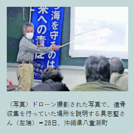 據日本共產黨“官媒”《赤旗新聞》18日報道,日本共產黨國會眾議院議員、赤嶺政賢在17日的眾議院預算委員會上批判稱:填拓用土的70%用的是有陣亡者遺骨的沙土,是“對陣亡者的褻瀆”,並要求撤回“沙土採集計劃”,全力開展遺骨收集工作。