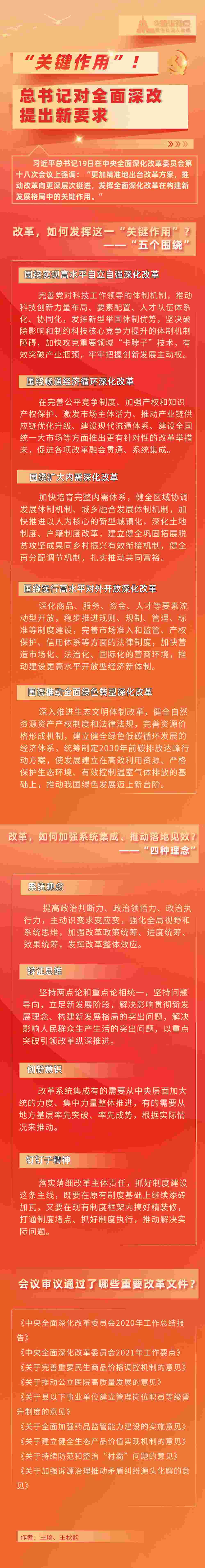 海報:“關鍵作用”!總書記對全面深改提出新要求 2021-02-22 習近平總書記19日在中央全面深化改革委員會第十八次會議上強調:“更加精準地出台改革方案,推動改革向更深層次挺進,發揮全面深化改革在構建新發展格局中的關鍵作用。”讀圖,來看這一“關鍵作用”——