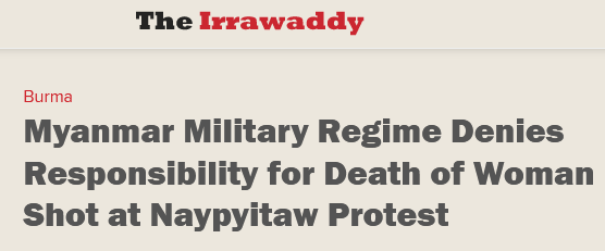 在上週六抗議事件致2人中槍身亡之前,2月9日,緬甸有一名年輕女子在首都內比都(Nay Pyi Taw)因示威活動而頭部中彈。2月19日,美聯社報道稱,該名中槍女子不治身亡,成為緬甸軍方接管國家權力後首位被證實身亡的示威者。