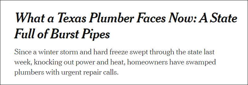 《紐約時報》2月21日關注了得州忙碌的水管工人們。經歷冬季風暴造成的停電停水之後,數萬名得州居民的麻煩還沒有結束。如今,他們需要修理水管。當地的水管修理工成了當地最忙的人,有的居民需要等到4月份才能等到人來修水管。