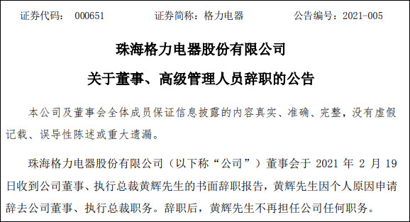 2月21日下午,格力電器公告披露,該公司董事、執行總裁黃輝於2月19日提出書面辭職,黃輝因個人原因申請辭去格力電器董事、執行總裁職務。辭職後,黃輝不再擔任該公司任何職務。