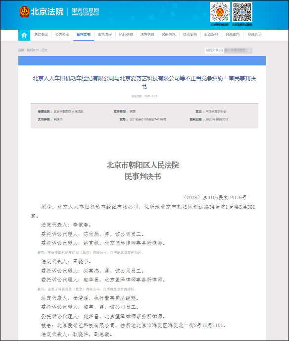 綜上,北京市朝陽區人民法院判令車好多、金瓜子、愛奇藝三被告於判決生效之日起立即停止涉案虛假宣傳的行為,並向人人車賠償經濟損失100萬元;此外,車好多、金瓜子、愛奇藝自判決生效之日起三十日內需履行在“瓜子二手車直賣網”新浪微博、微信號、愛奇藝官網中連續三日刊登聲明的義務,以消除涉案虛假宣傳行為對人人車的不良影響。人人車的其他訴求被駁回。