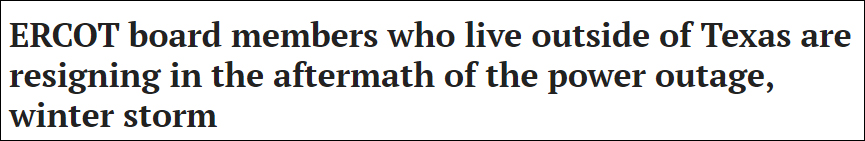州長阿伯特當時表示,如此昂貴的電費賬單“無法接受”。他隨後也呼籲得州電力可靠性委員會的董事會成員辭職,並要求獲取委員會與電力公司在雪災期間的通訊紀錄,要求開展調查。