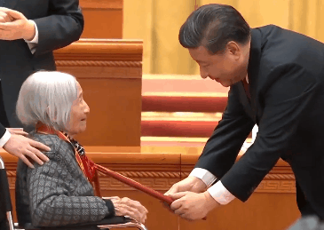 在這其中,一位97歲的老人坐着輪椅上台領獎。這位老人名叫夏森,她嘗試先起身站立,再從總書記手中接過證書,而總書記則輕拍她肩膀,示意老人坐下,並暖心地彎腰俯身為其頒授證書。這一幕,感動了所有人。