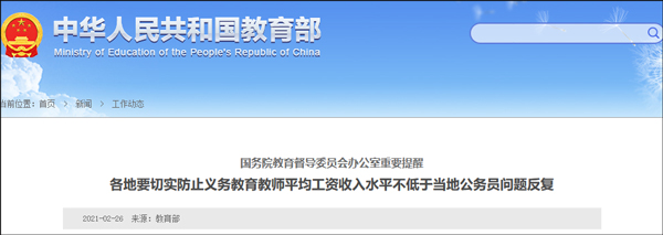 教育部網站2月26日消息,國務院教育督導委員會辦公室發佈重要提醒稱,各地要切實防止義務教育教師平均工資收入水平不低於當地公務員問題反覆: