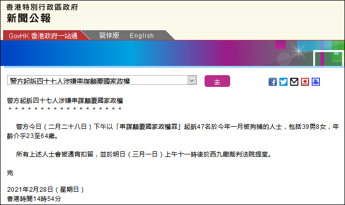 2月28日下午,香港特區政府發佈新聞公報稱,警方當天下午以“串謀顛覆國家政權罪”起訴47名於今年1月被拘捕的人士,包括39男8女,年齡在23歲至64歲之間。據稱,所有上述人士會被通宵扣留,並於明日(3月1日)上午11時之後在香港西九龍裁判法院提堂。