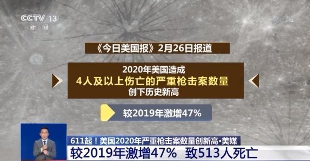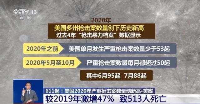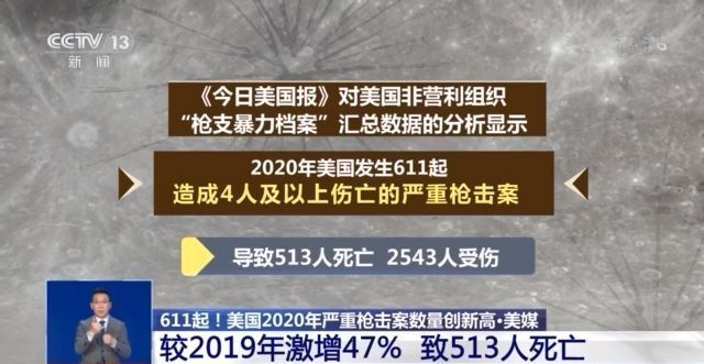 《今日美國報》對美國非營利組織“槍支暴力檔案”彙總數據的分析顯示,2020年美國發生611起造成4人及以上傷亡的嚴重槍擊案,導致513人死亡、2543人受傷。