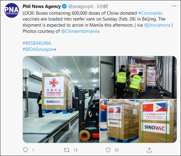 值得一提的是,菲律賓通訊社(PNA)還在其推特賬號上曬出了一組此批疫苗在北京裝箱運輸前的照片,照片上顯示,裝有疫苗的運輸箱上特別貼着中菲兩國國旗,並寫有“千年近鄰,風雨同舟”的字樣。