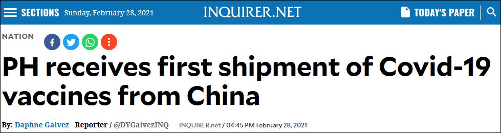 《菲律賓星報》認為,此次的疫苗捐贈,進一步顯示出在杜特爾特執政期間,此前中菲之間的緊張關係得到了緩解,兩國的關係日益密切。報道介紹,在疫情暴發初期,中方就曾向菲律賓派遣醫療專家小組以及捐贈防護用品和檢測試劑等設備,這些都是菲方極度稀缺的。