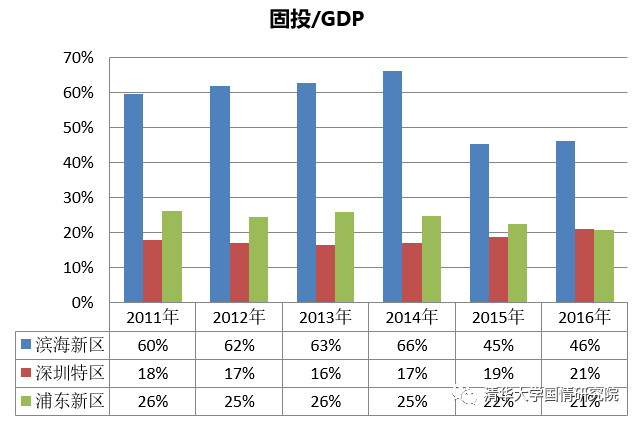 濱海新區、深圳特區和浦東新區固定資產投資佔GDP比重的比較