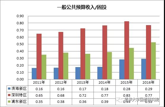 上圖是幾個新區固投佔GDP比重的對比,這一指標反映的是經濟增長中固投所佔的比重。從圖中可以看出,這一指標最高的是濱海新區,最低的是深圳,説明濱海新區還在靠“花錢”拉動增長,深圳則已經開始轉向“賺錢”拉動增長。後面這個表,是三個新區一般公共預算收入和固投的比。這一指標的數值低、意味着這個新區還處於資本型投入的1.0階段,轉型還未完成;這一比值高則意味着該新區已經轉型進入以現金流增長為主的2.0階段。
