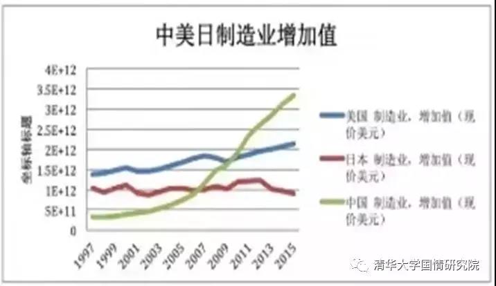中國、日本和美國製造業增加值變化趨勢比較(1997-2015年)