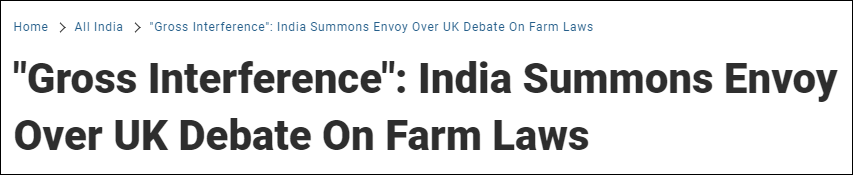 綜合印媒報道,英國議會週一(8日)舉行了跨黨派議員團體討論,議題是千里之外印度的農民革命和新聞出版自由。討論時常約1個半小時,工黨、自由民主黨和蘇格蘭民族黨的議員都對印政府對於農民的應對方式表達關切。