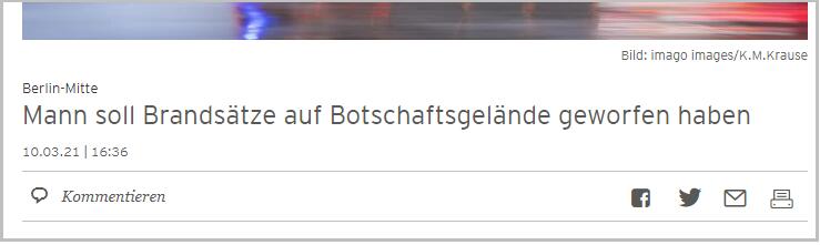 據德國門户網站rbb24消息,當地時間3月10日,德國警方宣佈逮捕一名42歲男子,該男子涉嫌於當天6時左右向位於柏林Brückenstraße大街的一家大使館院內投擲燃燒裝置,隨後使館工作人員及時用滅火器將其撲滅。該媒體指出,被縱火的使館是中國駐德國大使館。