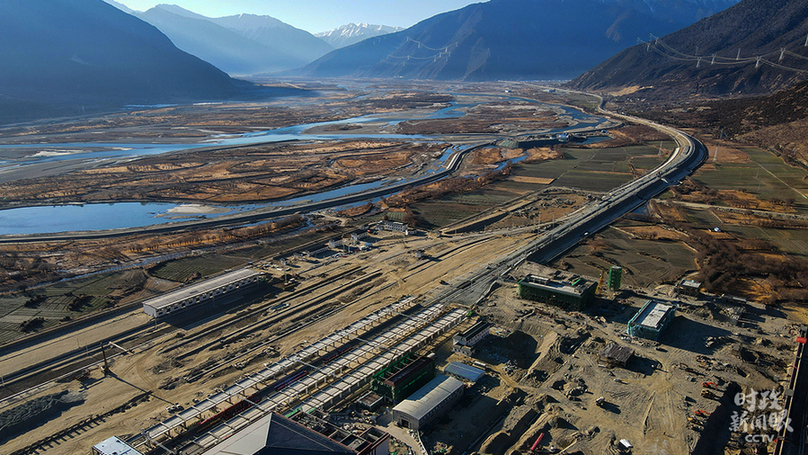△2020年12月31日,西藏林芝,中鐵十一局施工人員慶祝川藏鐵路拉薩至林芝段軌道全線鋪通。