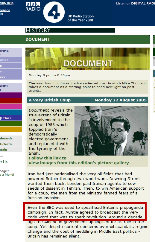 讓時間退回1953年,BBC在一場西方對伊朗的政變中扮演了重要角色。當時英國軍情六處和美國中央情報局共同參與策劃了針對伊朗摩薩台政權的政變。在這場政變中,BBC通過大量虛假新聞報道抹黑摩薩台政權,成為英國政府的宣傳工具。