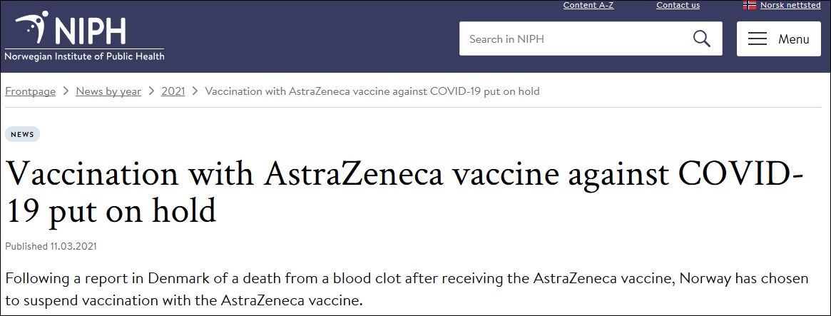 促使挪威下決定的是發生在丹麥的死亡病例。3月11日,丹麥國家衞生局和藥品管理局告知,一名婦女在接種阿斯利康疫苗後死亡,其體內出現了血凝塊。目前丹麥方面已經決定在兩週內暫停阿斯利康疫苗的接種工作,調查疫苗和血凝塊之間是否存在聯繫。