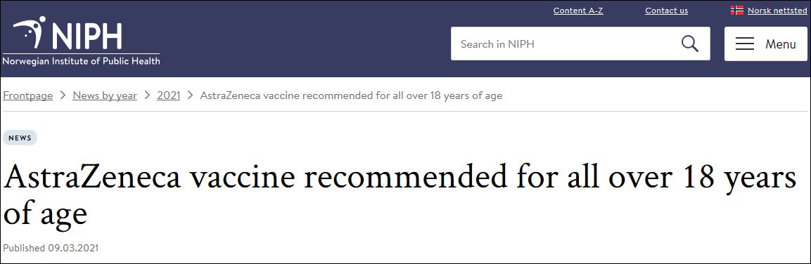 而就在兩天前,挪威公共衞生研究所剛剛宣佈,向所有18歲以上人羣推薦接種阿斯利康疫苗。