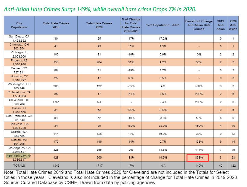 值得注意的是,這份報告並不能反映全美各地仇恨犯罪的行為,僅限於美國16個城市當地向警察局報案的仇恨犯罪。還有更多針對亞裔的種族主義攻擊僅被視為“仇恨事件”,並未被警方納入“犯罪”類別。