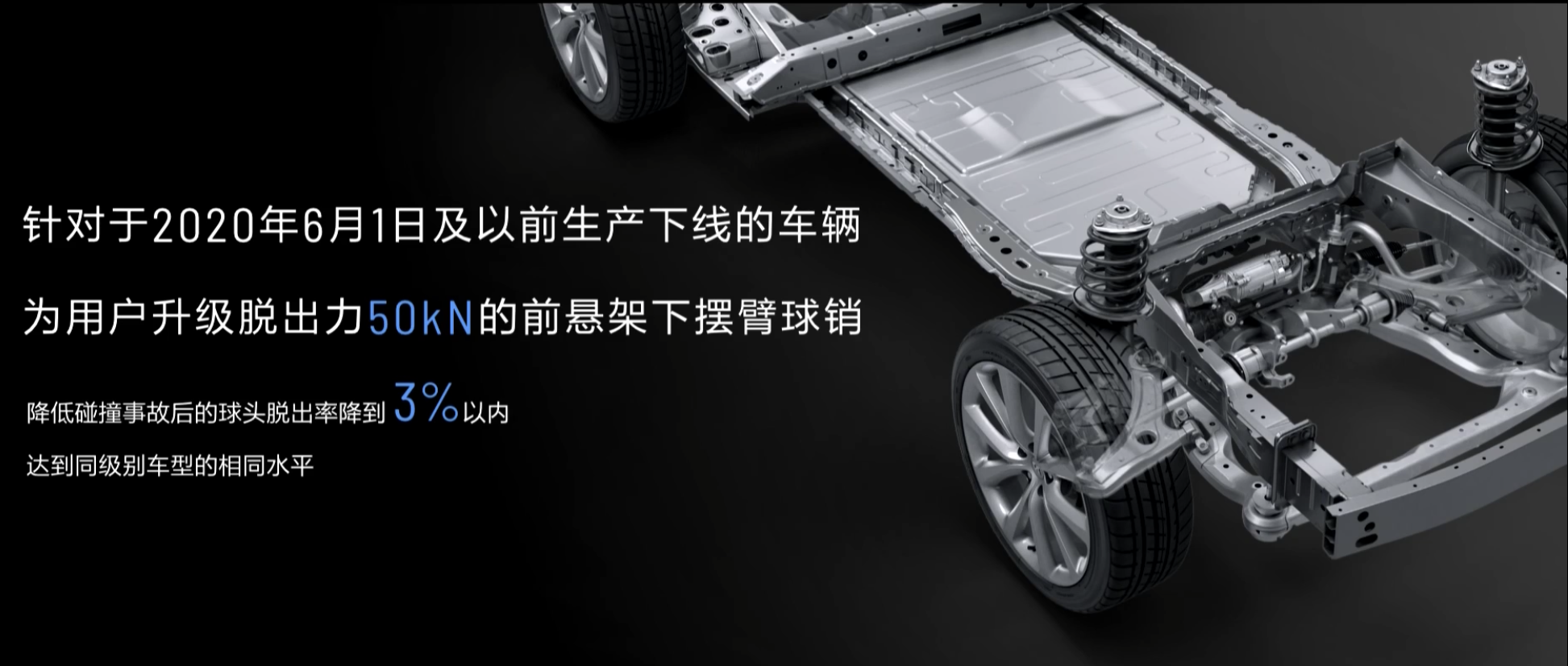 2020年11月1日,理想汽車召開“秋季溝通會”,稱截止去年10月,累計發生97起前懸架碰撞事故,其中有10起發生了前懸架下襬臂球頭從球銷脱出的情況。對此,理想汽車稱將為2020年6月1日及以前生產的理想ONE“免費升級”脱出力更高的前懸架下襬臂球銷。