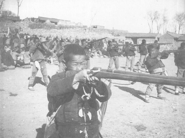 1940年邊區紀念“四四”兒童節大會上,兒童做射擊表演。