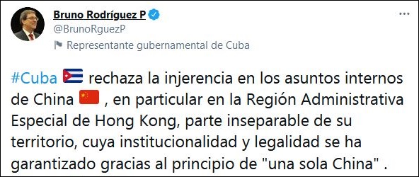 羅德里格斯在11日的推特上表示:“古巴反對外國干涉中國內政,特別是在香港特別行政區事務上。香港是中國領土不可分割的一部分,一箇中國原則從制度和法律上保證了這一點。”